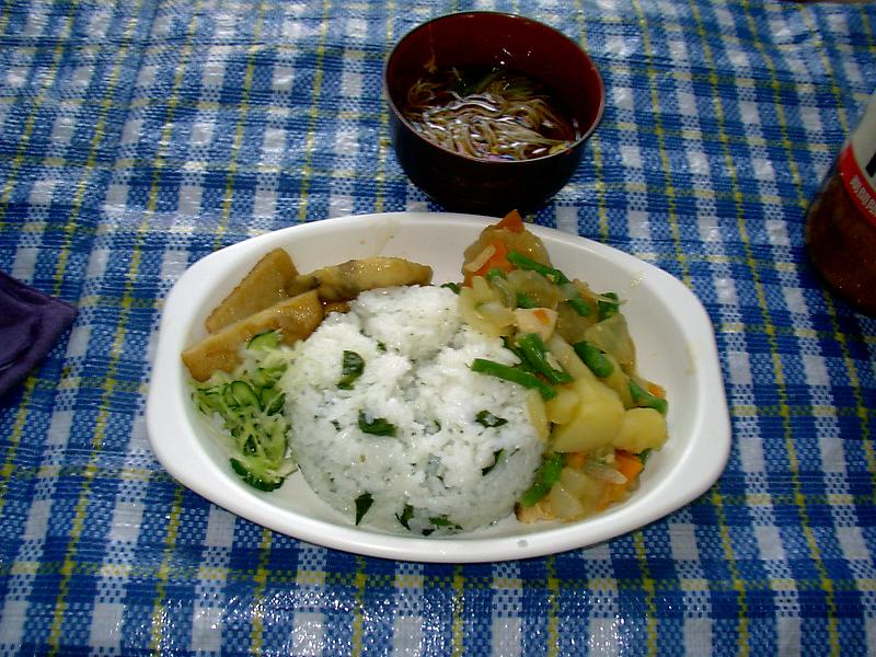 2009年6月16日(火) 本日のメニュー:わかめご飯 肉じゃが(鶏肉・玉葱・じゃが芋・人参 いんげん豆) 素麺(三つ葉・生姜) 酢の物(きゅうり・キャベツ・玉葱) 天ぷら(丸天・牛蒡巻・キクラゲ入り・烏賊入り・餃子入り)