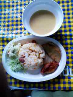 本日のメニュー:ウィンナー入りピラフ (ウィンナーソーセージ・鶏肉・玉葱・人参) ポテトサラダ(じゃが芋・きゅうり・玉葱・人参) 千切り野菜の酢の物(キャベツ・きゅうり・生姜) 天ぷらの煮物 コーンスープ ロールケーキ