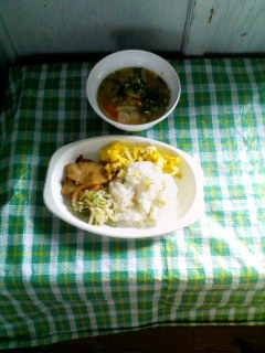 2009年10月6日(火) 本日のメニユー:さつま芋ご飯 天ぷらの煮物 いり卵 酢の物(きゅうり・キャベツ・大根) 鶏汁(鶏肉・じゃが芋・人参・玉葱・大根)