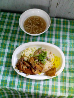 本日のメニュー:混ぜご飯(鶏肉・天ぷら・しめじ・干し椎茸・人参・牛蒡 いんげん) 天ぷらに煮物 ポテトサラダ(じゃが芋・きゅうり・人参) たくわん 冬がんとベーコンのスープ