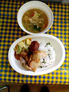 本日のメニュー:ワカメご飯(ワカメ、ちりめんじゃこ) 鶏汁(鶏肉・牛蒡・人参・大根・じゃが芋・葱・生姜 大根葉) 天ぷらの煮物 白菜とフルーツのサラダ(白菜・柿・りんご) たくわん 配食数 :184人 ボランティア数:43人 ★ 今日は民生委員のボランティアさんが7人来られ、野菜の皮むきや刻み を手伝って下さいました。それで、このような材料の多い献立が時間内 に出来上がりました。