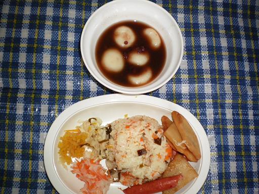 2010年1月5日(火) 本日のメニュー: 混ぜご飯(天ぷら・人参・椎茸・昆布) ウィンナーソーセージ 紅白なます(大根・人参) ぜんざい、白菜漬物
