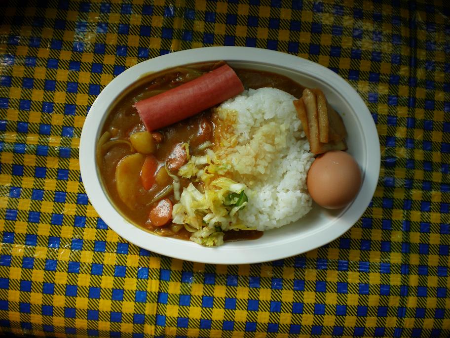 本日のメニュー: カレーライス、ゆで卵、ウィンナーソーセージ 天ぷらの煮物、漬物(きゅうり・白菜・生姜・ 鰹節) 大根甘酢漬け