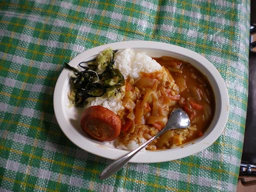 本日のメニュー: カレーライス(鶏肉・じゃが芋・人参・玉葱) 酢の物(キャベツ・わかめ・りんご・鰹節) 天ぷらの煮物、らっきょう