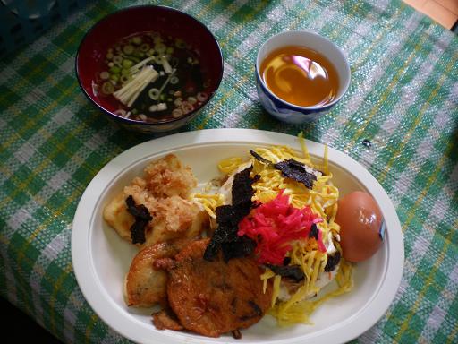 天ぷらの煮物、白身魚のフリッター お吸い物(わかめ、葱、えのき) ゆで卵(イースターエッグ)