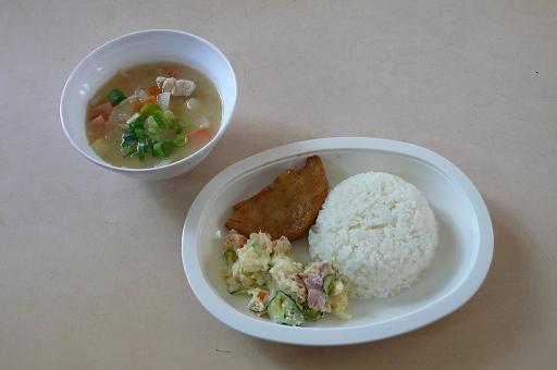 本日のメニュー: ご飯 鶏汁(鶏肉・玉葱・じゃが芋・人参・大根 牛蒡・葱・味噌)