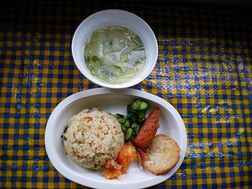 本日のメニュー: 炊き込みご飯(鶏肉・干椎茸・人参・牛蒡) 天ぷらの煮物 ジャーマンポテト(じゃが芋・ベーコン 人参) みそ汁(玉葱・葱・牛蒡・ふ・わかめ)