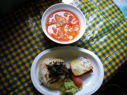 本日のメニュー: 人参ライス(人参・バター・コンソメ) 天ぷらの煮物、ソーセージ サルサスープ(人参・玉葱・じゃが芋・鶏肉 トマト缶) 瓜と茄子の塩もみ 蕗の葉と昆布、鰹節の佃煮 お土産 : バナナorりんご、パン 配食数 : 126人 ボランティア数: 33人