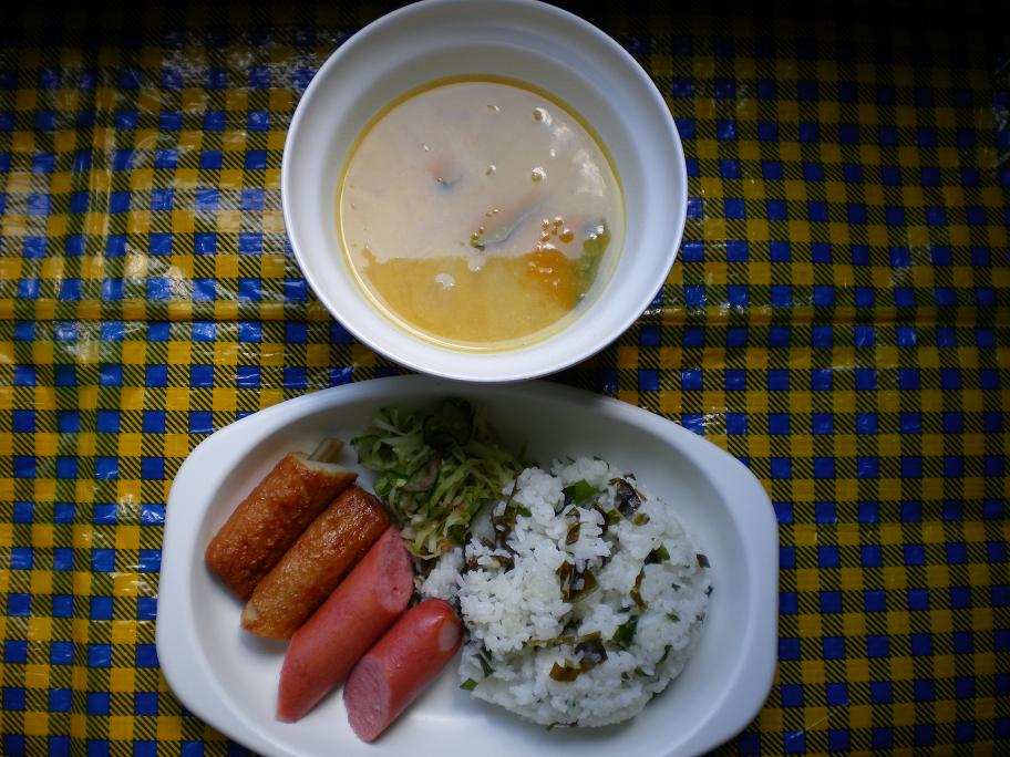 本日のメニュー: わかめご飯 鶏汁(鶏肉・南瓜・じゃが芋・玉葱) 天ぷらの煮物、ウィンナー 野菜の塩もみ(胡瓜・キャベツ・鰹節) お土産 : バナナorりんご、パン、おにぎり(梅干し)