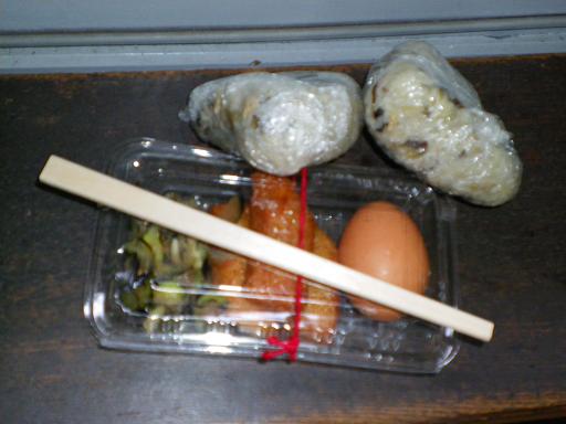 本日のメニュー: 炊き込みご飯(鶏肉・牛蒡・キクラゲ) ゆで卵、天ぷらの煮物 茄子と生姜の浅漬け(鰹節) お土産 : りんごorバナナ、パン、ロールケーキ