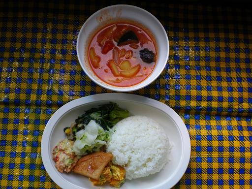 本日のメニュー:(朝)卵入りおかゆ、秋刀魚の煮つけ缶、 南瓜スープ(65人分) (昼)トマトスープ(じゃが芋、玉葱、人参 鶏肉、茄子、ペンネ 鮭のタルタスソースかけ、 小松菜、ほうれん草、ブロッコリー、れんこん、 トウモロコシのソテー 南瓜の煮物、大根と白菜、胡瓜、柚子の即席漬 天ぷらの煮物 お土産 : りんごorバナナ、パン